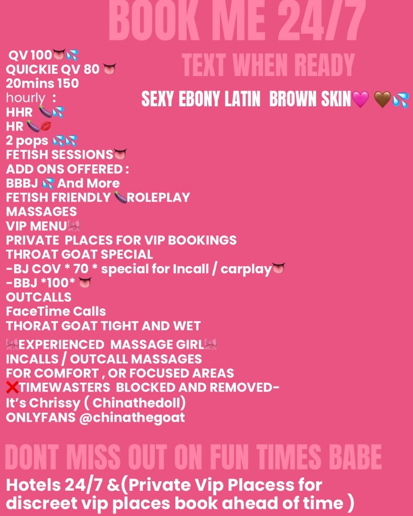 ⭐Top Tier Non rushed 5 star service ⭐ Throat Goat 👅💦 Tight and Wet 💦 MENU: text when ready QV 🍆💦 HHR /HR💦💦 BJ /BBJ👅🍆 MASSAGES HAPPY ENDING👅 RIM JOB 💦 GFE FETISH FRIENDLY 👅🍆 👅doggy , 69 , rimming , facials add on fee 🍆 🥂ASK 4 VIP MENU-for private sessions/places- OUTCALLS/OVERNIGHT💋(deposit or no reply) my site : https://msha.ke/thedollbookings MY VIDS ONLYFANS💦🍆@mamithegoat Timewasters get blocked /Lowballers removed • no rushed session • 24/7 text to book name : china / chrissy